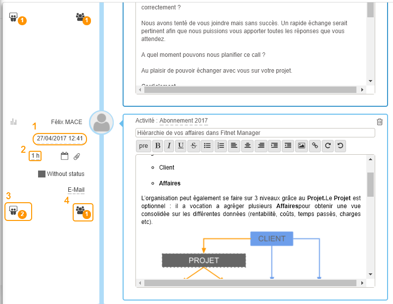 Connectez vous sur votre environnement Fitnet, allez sur l'affaire puis cliquer sur le rapport le suivi des activités commerciales.
