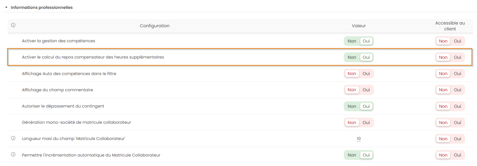 Paramétrage > Données RH > Activer le calcul du repos compensateur des heures supplémentaires