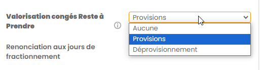 Pour valoriser le reste à prendre des congés, il suffit de se rendre dans Configuration > Activités > Types d'absences, et de sélectionner le choix voulu dans la liste déroulante en question.