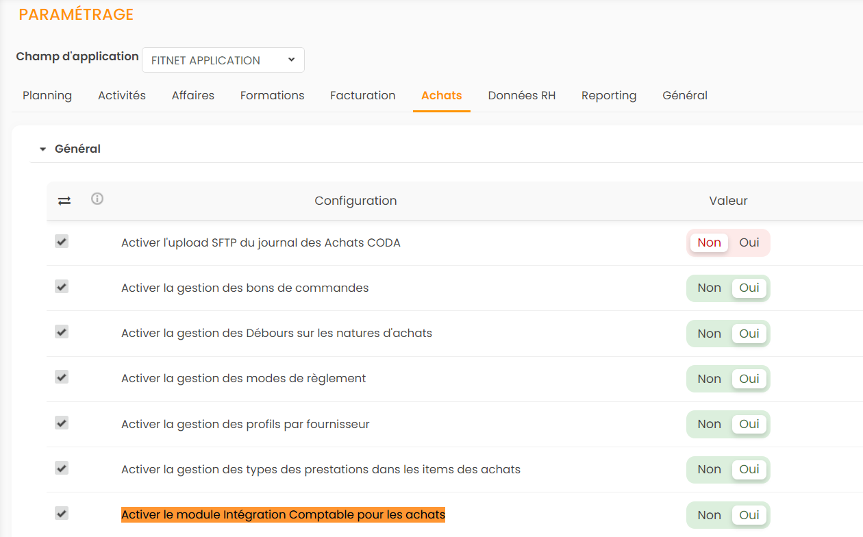 Pour activer l'intégration comptable de vos ACHATS, rendez-vous dans Paramétrage > onglet Achats :