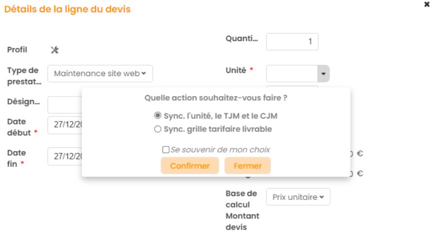 Le Prix Un HT se synchronise en fonction de la configuration de sa grille tarifaire rattachée. Pour toute modification des données Type de Prestation, Date, Quantité, lors de la création du devis, un pop-up s'affiche afin de confirmer la synchronisation du montant selon la grille tarifaire