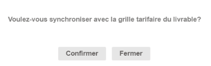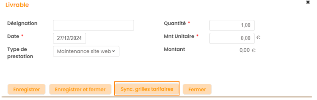 Le bouton Sync. grilles tarifaires permet de mettre à jour le montant du livrable sélectionné, si il y a eu modification de sa grille tarifaire sans qu'elle soit synchroniser au niveau de la gestion de Grilles tarifaires.