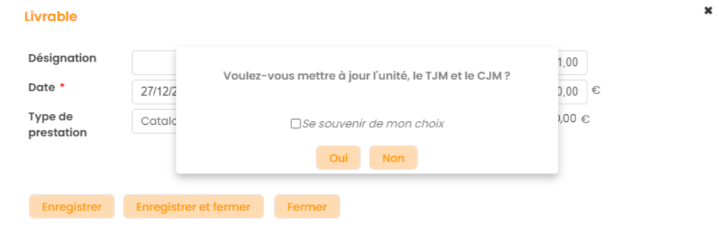 Le Prix Un HT se synchronise en fonction de la configuration de sa grille tarifaire rattachée.Pour toute modification des données Type de Prestation, Date, Quantité, lors de la création du livrable, le pop-up précédent s'affiche afin de confirmer la synchronisation du montant selon la grille tarifaire.