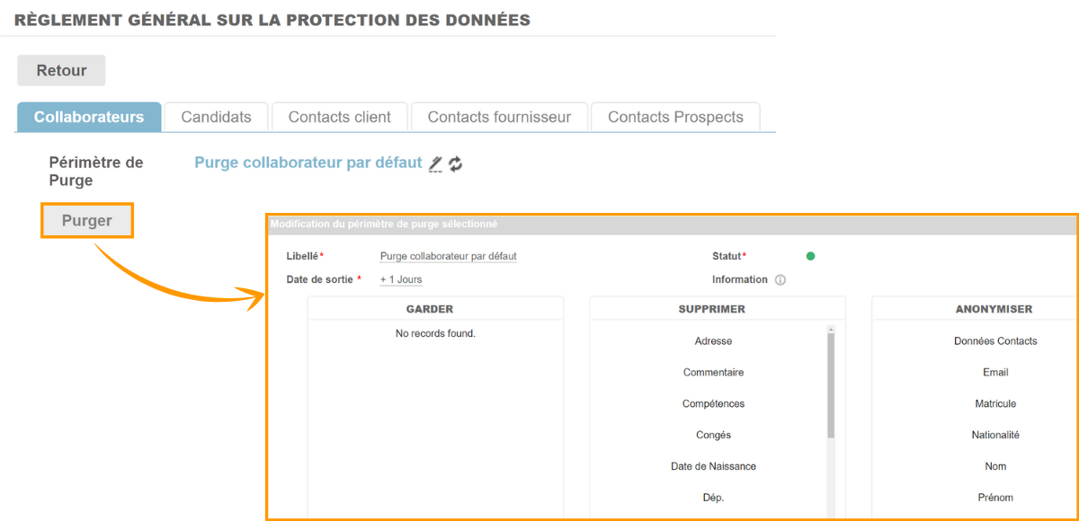 Le nouveau module RGPD offre la possibilité de purger en masse les données personnelles sur les différents objets :