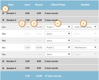 2/ 3/ Une saisie ligne par ligne simplifiée des jours/heures passés par projet.