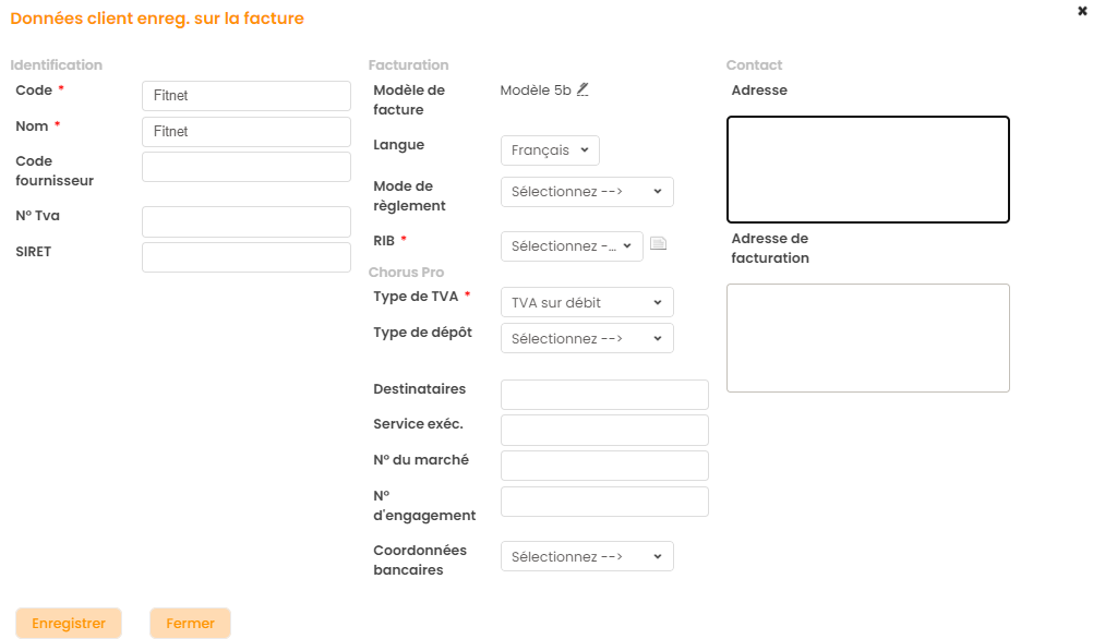 A savoir : Fitnet permet de gérer une liste d’adresses de facturation par client au niveau de la fiche client.