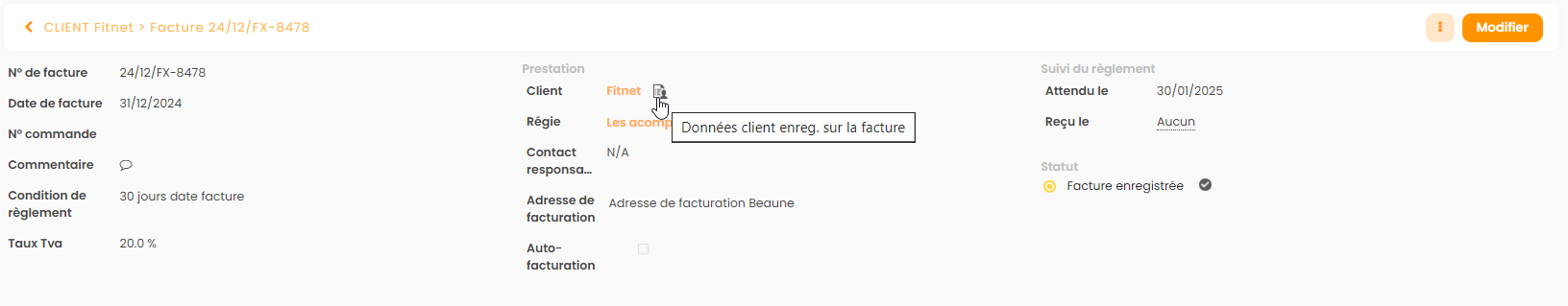 Les données clients de la facture sont modifiables à tout moment via l’icône