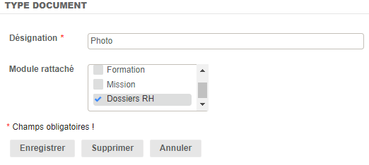 Il est alors possible d'ajouter des types de documents, qui seront sélectionnables dans les modules rattachés :