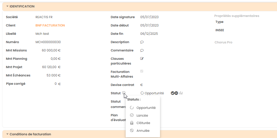 Lorsqu’une affaire est créée, elle est automatiquement poussée en statut “Opportunité”. L’affaire n’est pas encore lancée en production, il n’est donc pas disponible de saisir des temps ou des notes de frais par exemple.