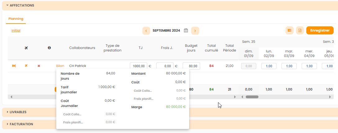 - Modification des affectations initiales : jours, tarifs, services livrables etc.
