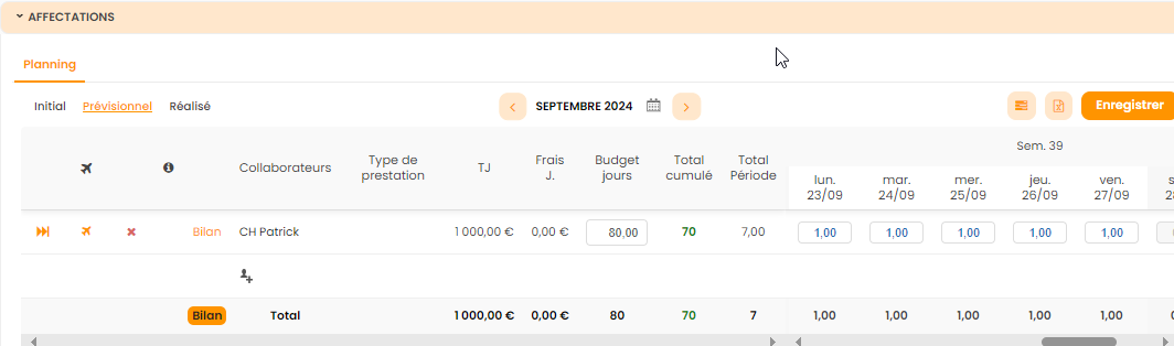 A ce stade il est déjà possible de créer un premier planning : le “Planning initial” afin d’affecter les collaborateurs et ainsi construire le prévisionnel.