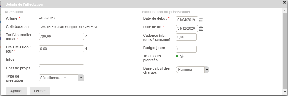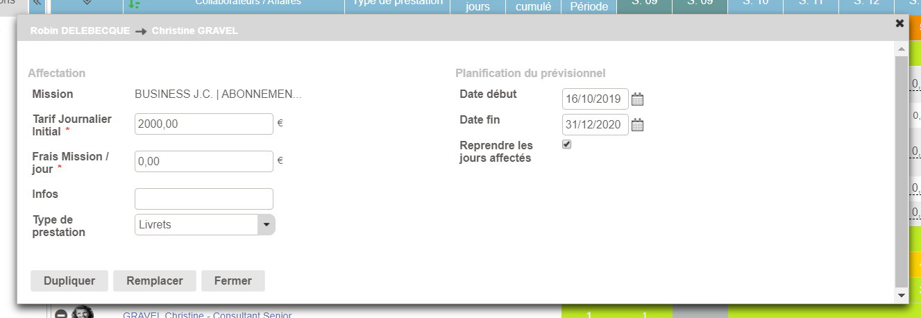 Une pop-up présentant les détails de l’affectation s’ouvre suite au “glisser-déposer”. Elle permet de définir les paramètres de l’intervention type nombre de jours, services livrables etc - exactement comme l'affectation d'un collaborateur au niveau de l'affaire, expliqué ici.