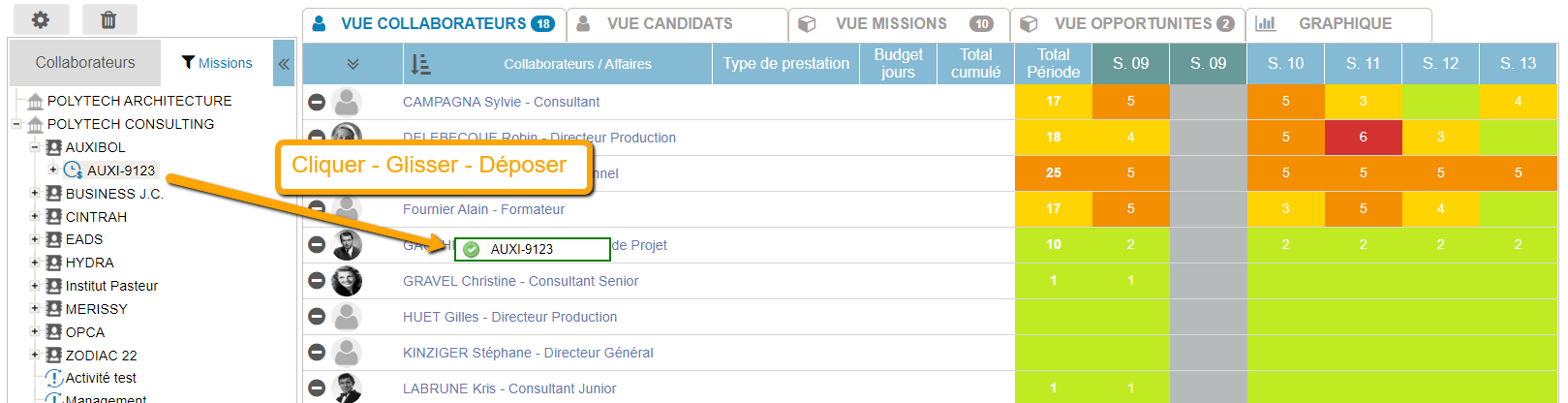 Il faudra naviguer dans ce menu pour sélectionner l’affaire en question puis la faire glisser sur le collaborateur afin de créer la nouvelle affectation.