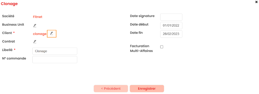 • Le même client : La nouvelle affaire sera clonée sur le même client