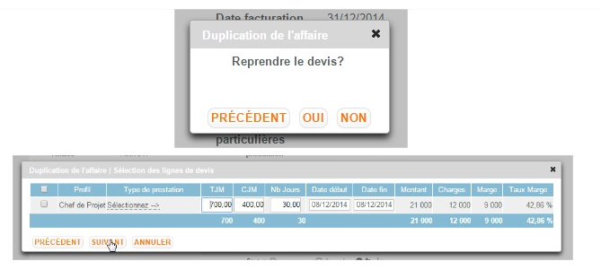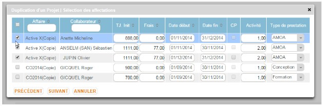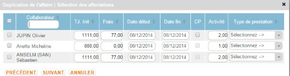 Il est possible de reprendre tout ou partie des collaborateurs affectées aux affaires reprises. Le système permet de conserver à l’identique ou modifier les affectations (TJ, dates etc).