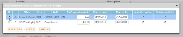 Il est possible de reprendre les équipes et BU affectées à l’affaire source. Le système permet de conserver à l’identique ou modifier les affectations (TJ, dates etc).