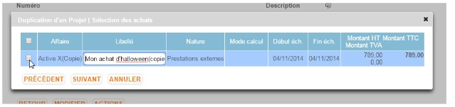 Il est possible de reprendre tout ou partie des affaires rattachées au projet source, en les conservant telles quelles ou en modifiant directement les éléments principaux (libellés, dates).