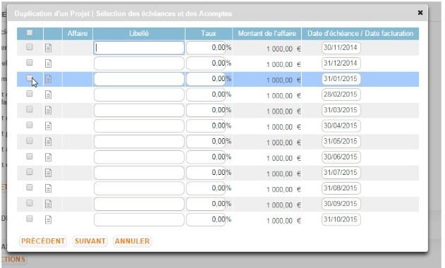 Il est possible de reprendre tout ou partie des échéances planifiées dans les affaires reprises. Les modifications en terme de montant, libellé ou date sont également disponibles.