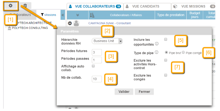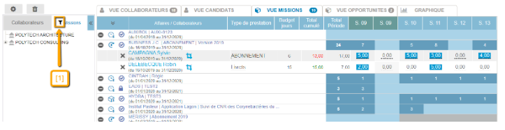 Dans le Capacity planning, il est possible en amont de choisir les missions que l'on souhaite affecter. Pour accéder à ces filtres-là dans l'application, il est nécessaire de cliquer sur l'entonnoir à gauche de l'écran (voir [1]).