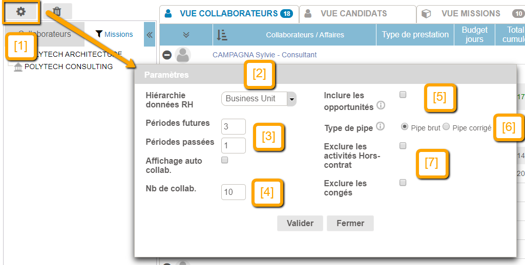 Dans le Capacity Planning, il est possible, en amont de choisir les ressources que l'on souhaite affecter. Pour accéder à ces filtres-là dans l'application, il est nécessaire de cliquer sur le pipe sur la gauche de votre écran (voir [1]).