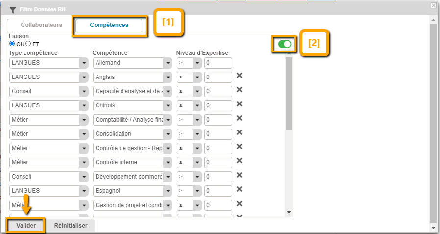 Enfin, sélectionner les compétences et le niveau requis pour être affichés dans la liste des collaborateurs.
