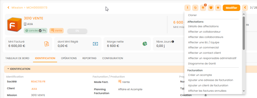 Le bouton action regroupe l’ensemble des fonctions disponibles sur une affaire.
