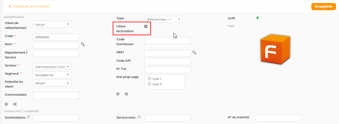 Une fois ce paramétrage effectué et le client ayant été déclaré "Client de facturation" :