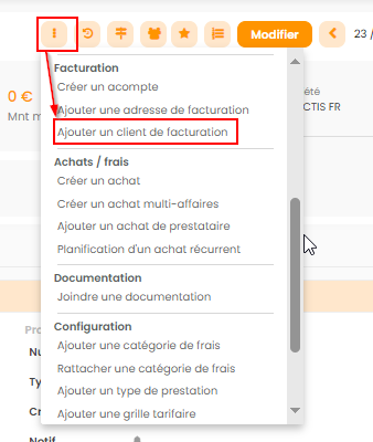 Dans chaque affaire le bouton "Actions" permet d’ajouter un client de facturation