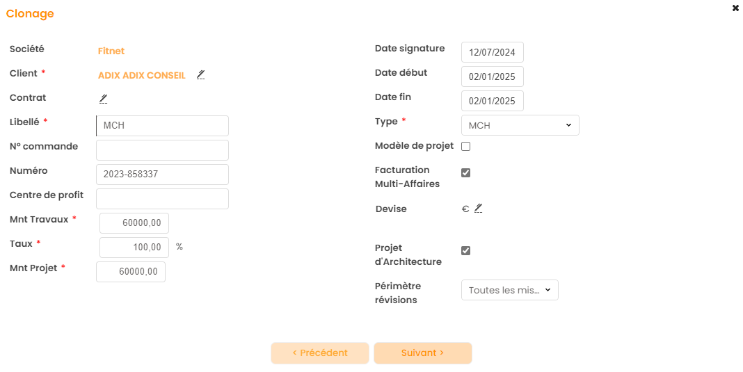 Lorsque l’on clone le projet, il s’agit aussi de cloner les différentes phases du projets (affaires). Il est possible de ne pas cloner toutes les phases, ou encore de modifier les champs qui les caractérisent.