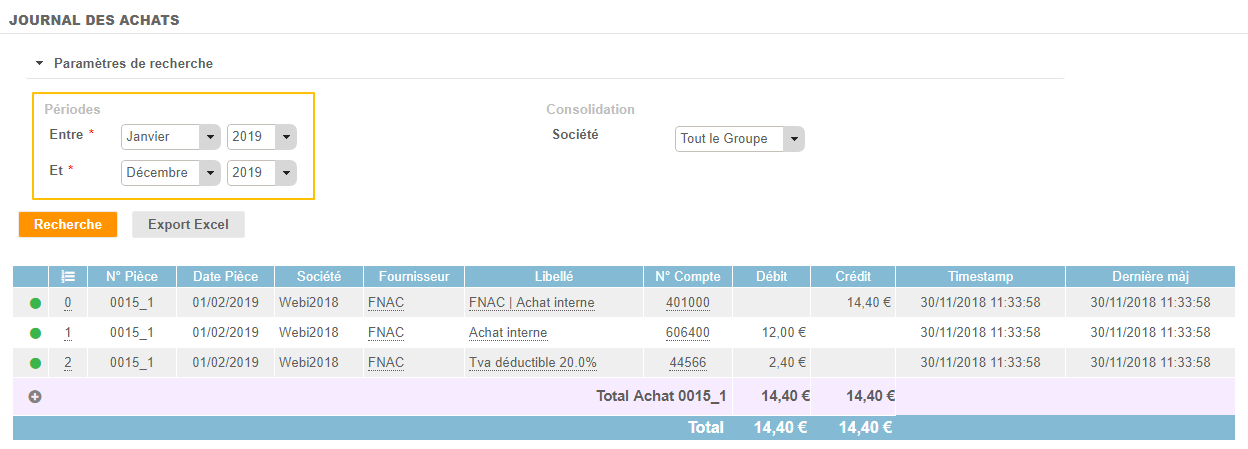 Enfin, ce journal est exportable au format .XSL grâce au bouton Export Excel.