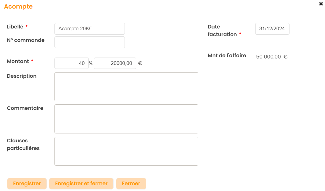- Date de facturation : Date de la proposition de facture d'acompte
