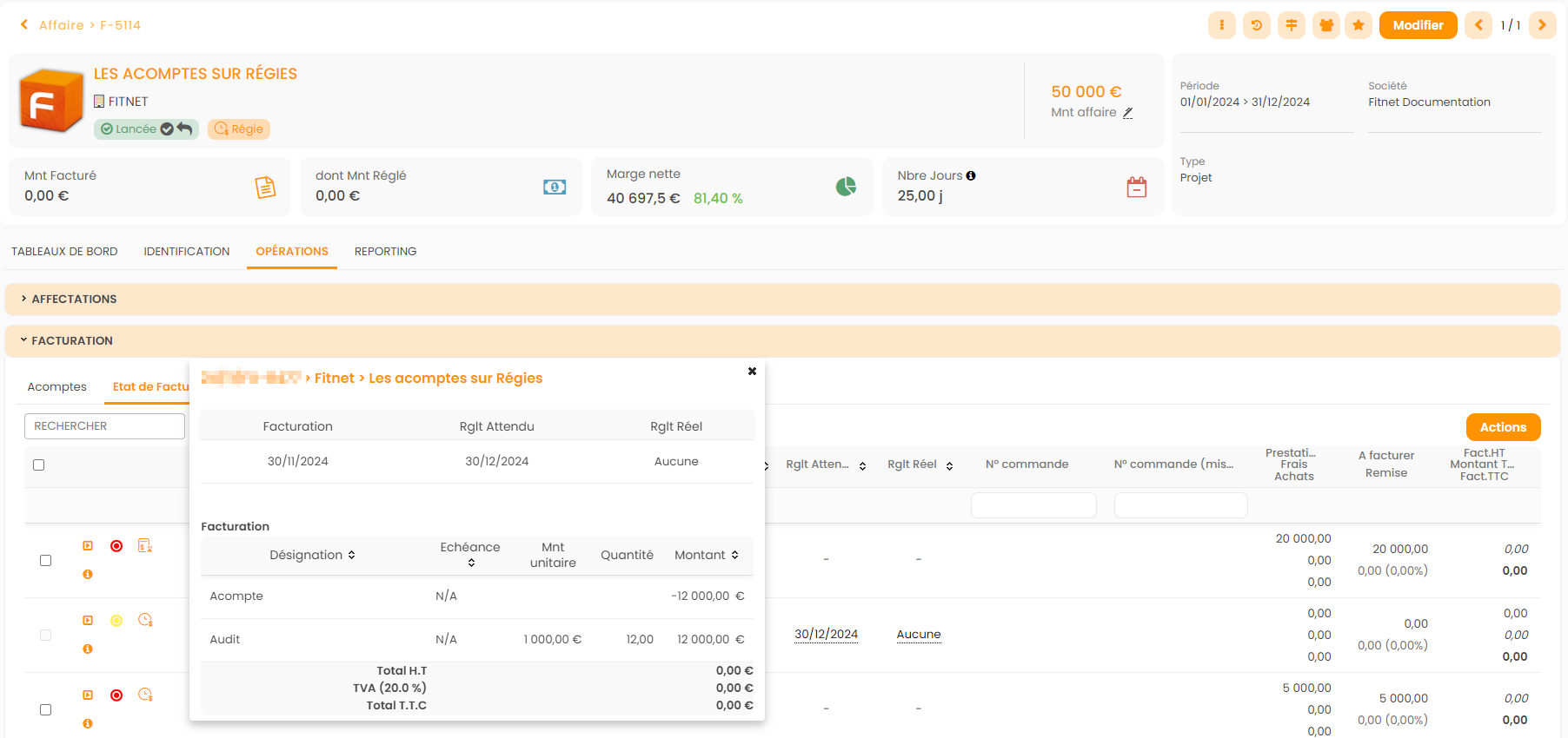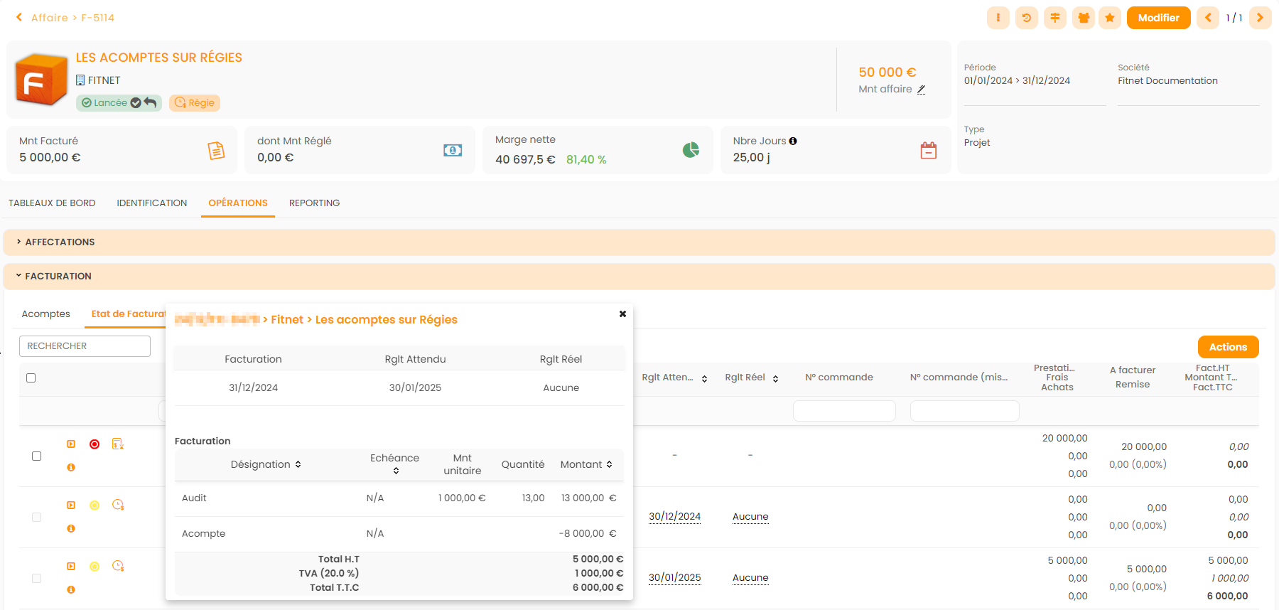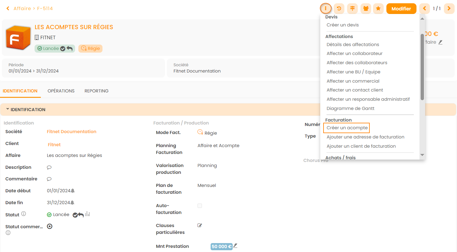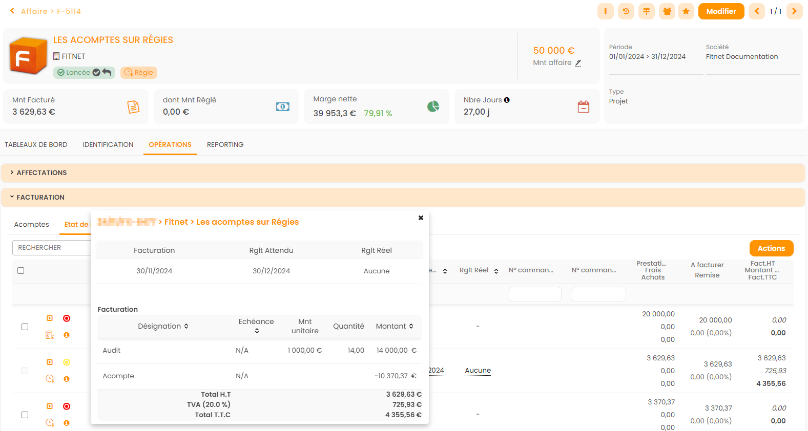 - En Planning Facturation : Affaire et Acompte