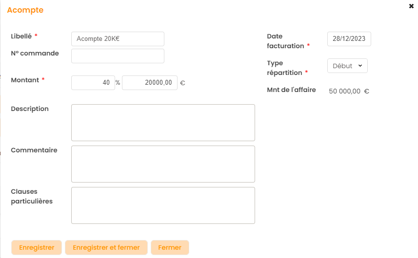 - Date de facturation : Date de la proposition de facture d'acompte
