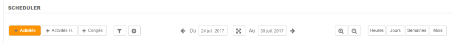 Le collaborateur doit sélectionner en haut à gauche du scheduler le type de saisie : Congés, Activités, ou Activités Horaires (heures supplémentaires) :
