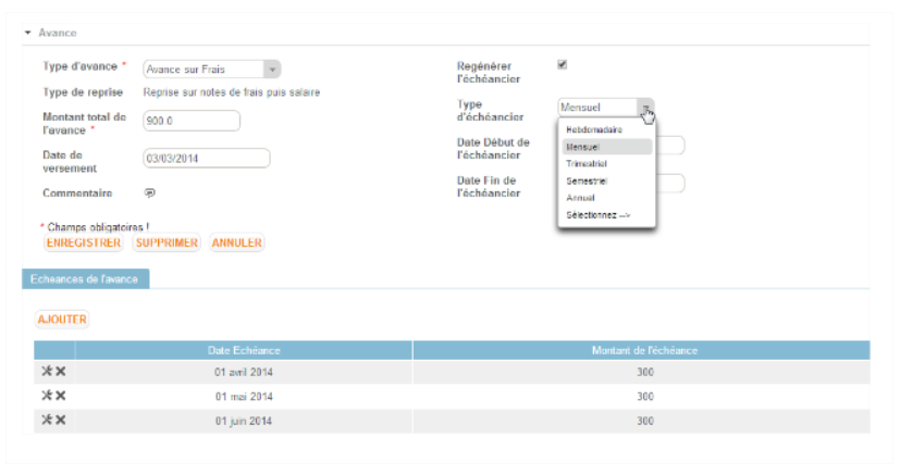 • Le type d’avance : Liste configurable (Configuration > Dossier RH > Types d'avance)