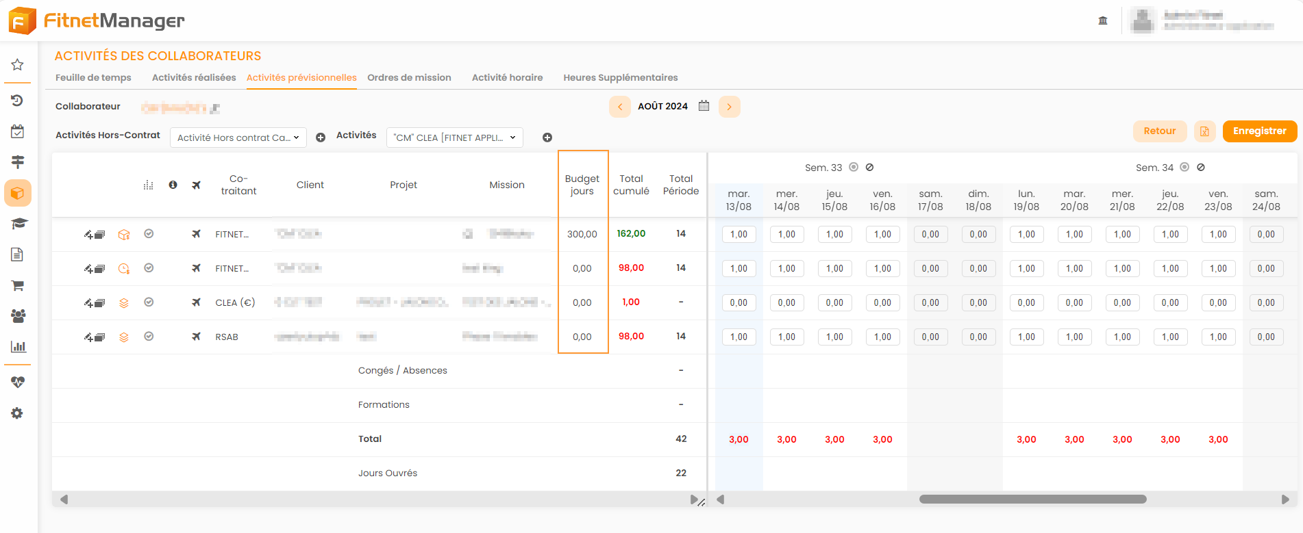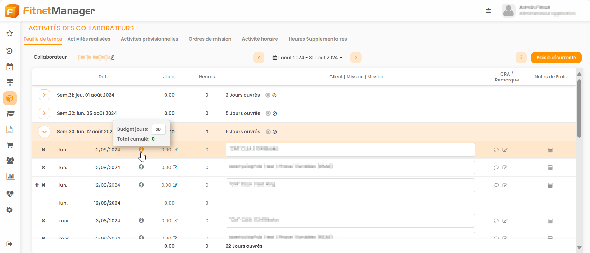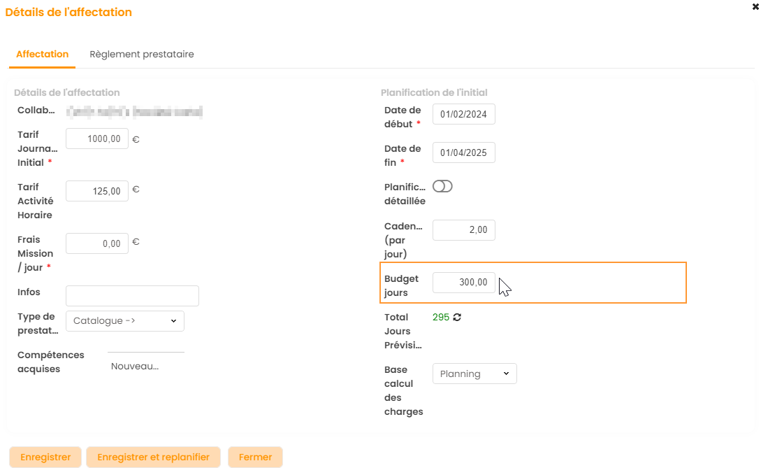 Lors de l'affectation d'un collaborateur sur une activité, vous pouvez définir un budget jours, indépendamment de la définition de la cadence.