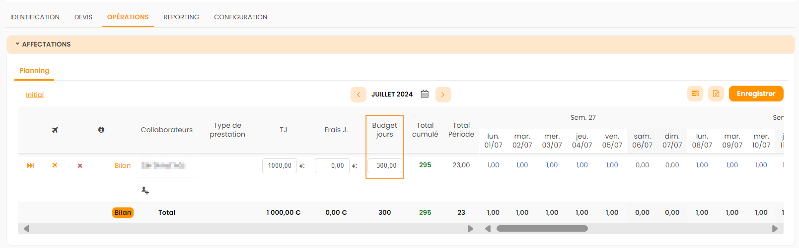 Le montant de budget jours apparaît dans les différents plannings de l'outil :