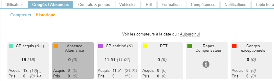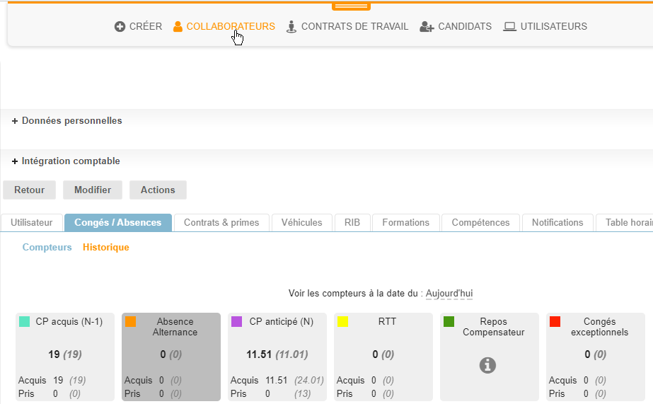Les compteurs peuvent être mis à jour directement dans la fiche collaborateur, pour la période en cours pour chaque type d’absence.