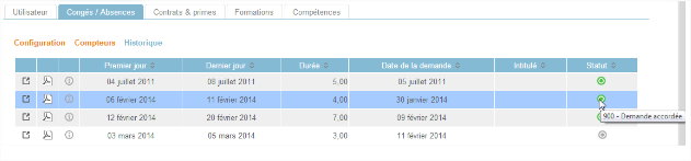 L’historique des demandes de congés et des déclarations d’absences du collaborateur est accessible directement dans son dossier RH.