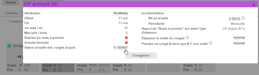 Le nombre de jours acquis à incrémenter chaque mois peut être configuré spécifiquement pour chaque collaborateur.