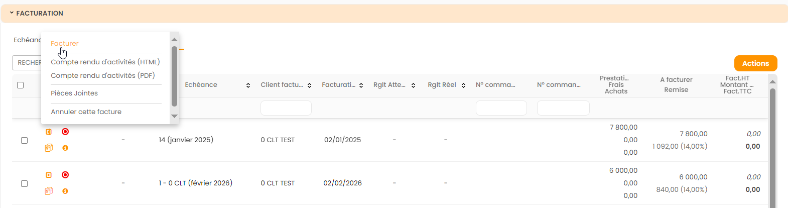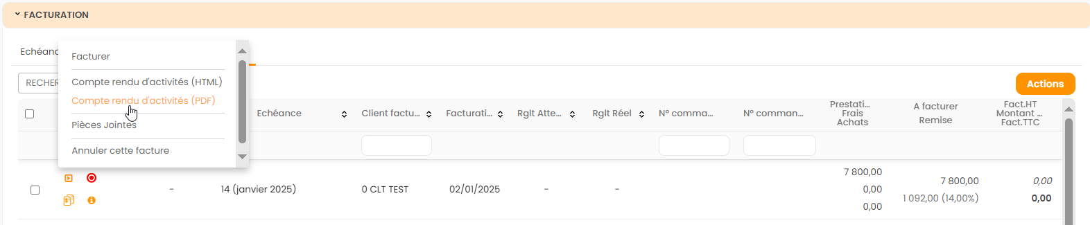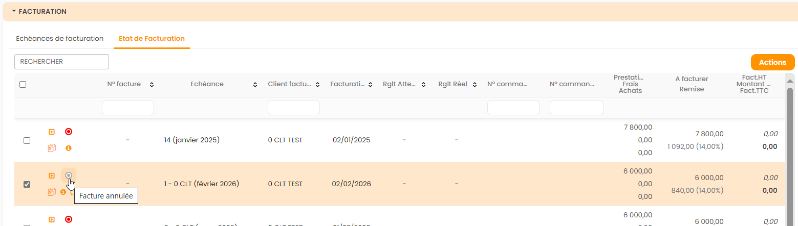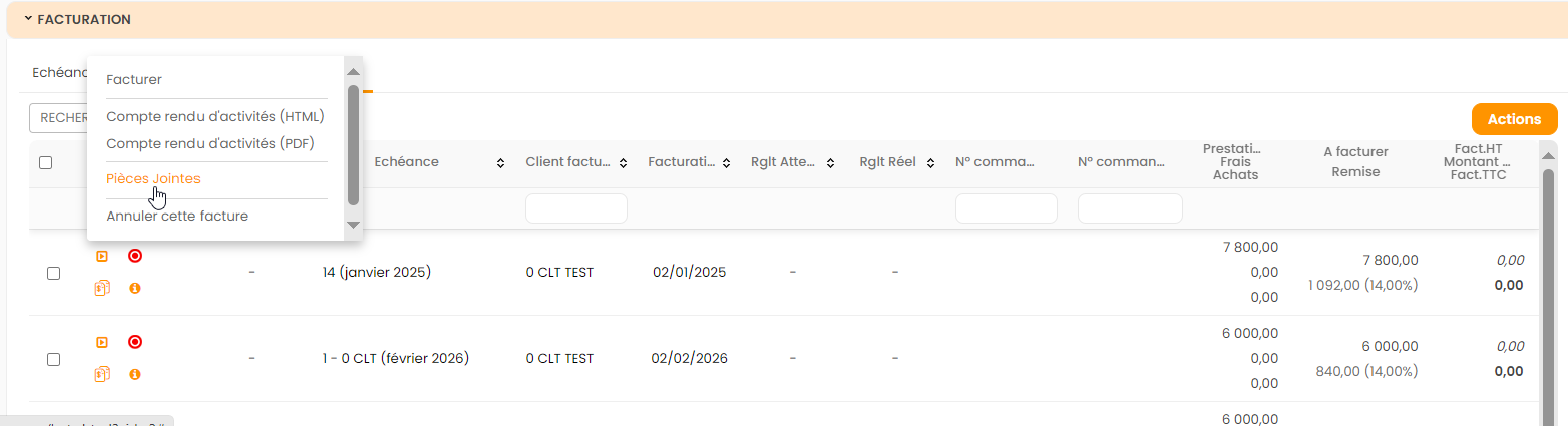 Les actions disponibles en facturation