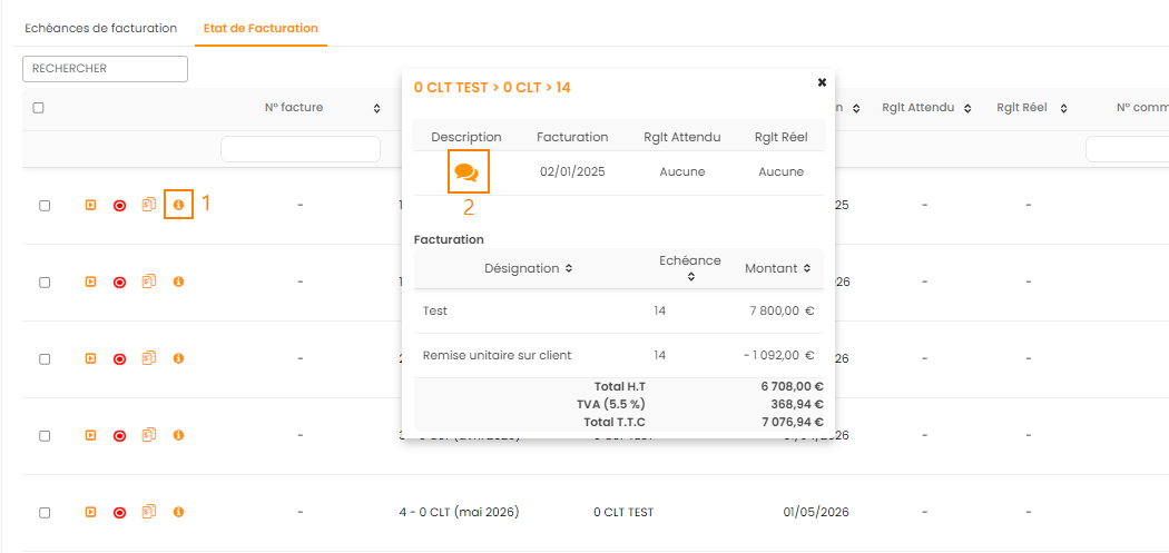 [1] permet de consulter les items de la facture à émettre. Lorsqu'une description est renseignée sur une facture, l'indicateur [2] est coloré. Il suffit de passer en Roll-over sur l'icône pour voir apparaître la description.