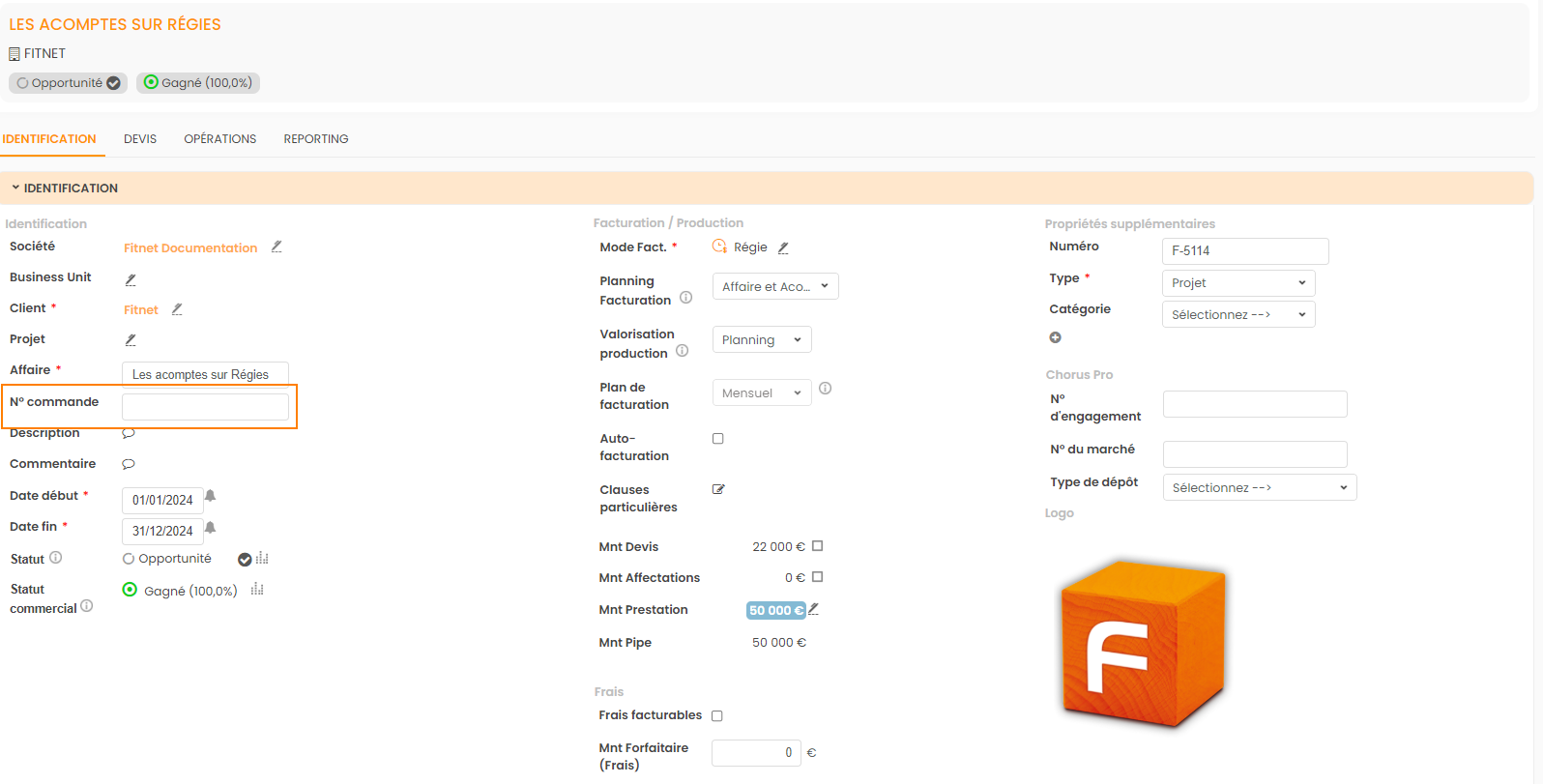 On peut renseigner le n° de commande sur l’écran de l’affaire. Il est possible de le faire à la création, ou depuis le bouton “Modifier” que l’on a sur l’écran d’une affaire.
