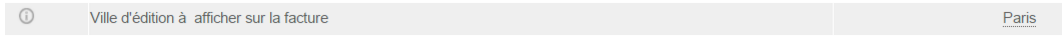 Pour modifier la ville d’édition de la facture, se rendre dans Paramétrage > Facturation > Paramètres de facture > Ville d’édition, et modifier le champ.