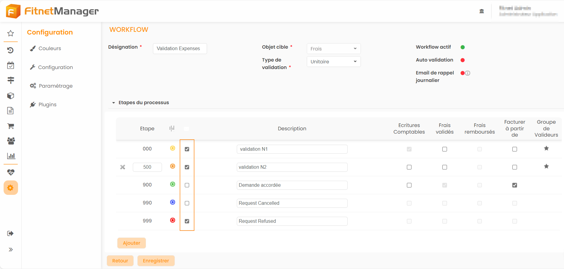 - Pour que les valideurs reçoivent une notification lorsqu'une nouvelle demande est émise : cocher les checkboxs à partir de l'étape 000 jusqu'à 899.