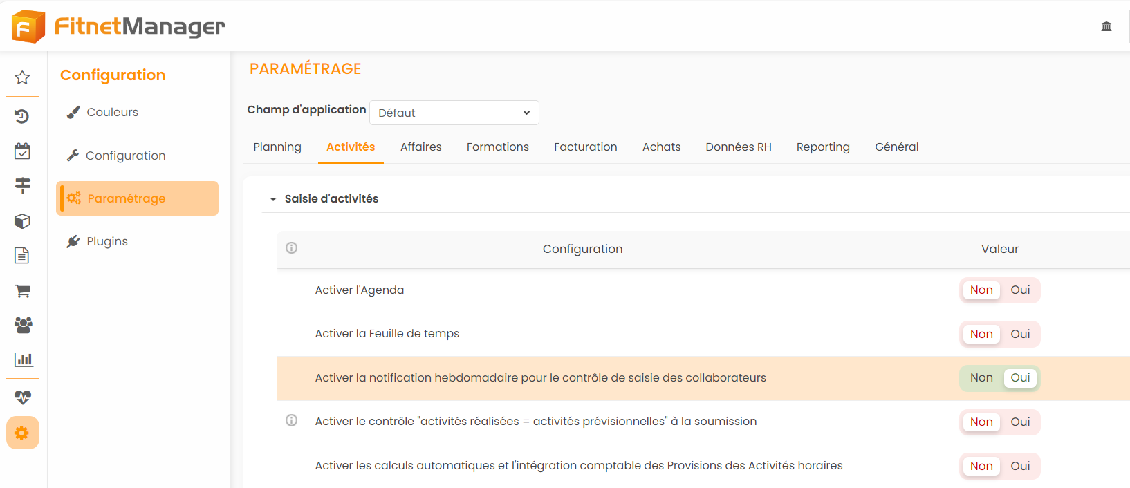 Spécifiquement pour la saisie des temps, il est possible d'activer un paramètre qui permet l'envoi d'un email hebdomadaire pour les collaborateurs qui ne remplissent pas leur feuille de temps (email envoyé chaque lundi pour une saisie de temps incomplète la semaine précédente). Ce paramètre est disponible depuis le Paramétrage > onglet Activités > "Activer la notification hebdomadaire pour le contrôle de saisie des collaborateurs.