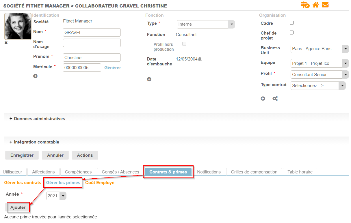 La gestion des primes collaborateurs se fait depuis le dossier de chaque collaborateur :