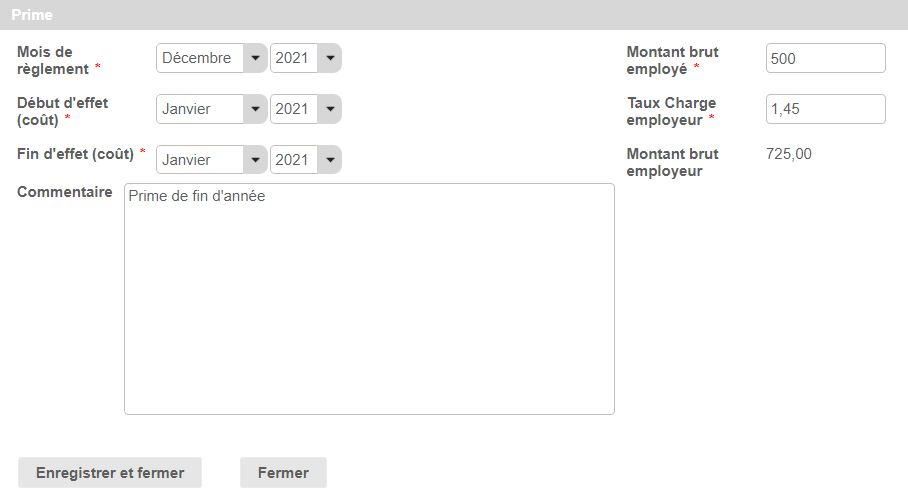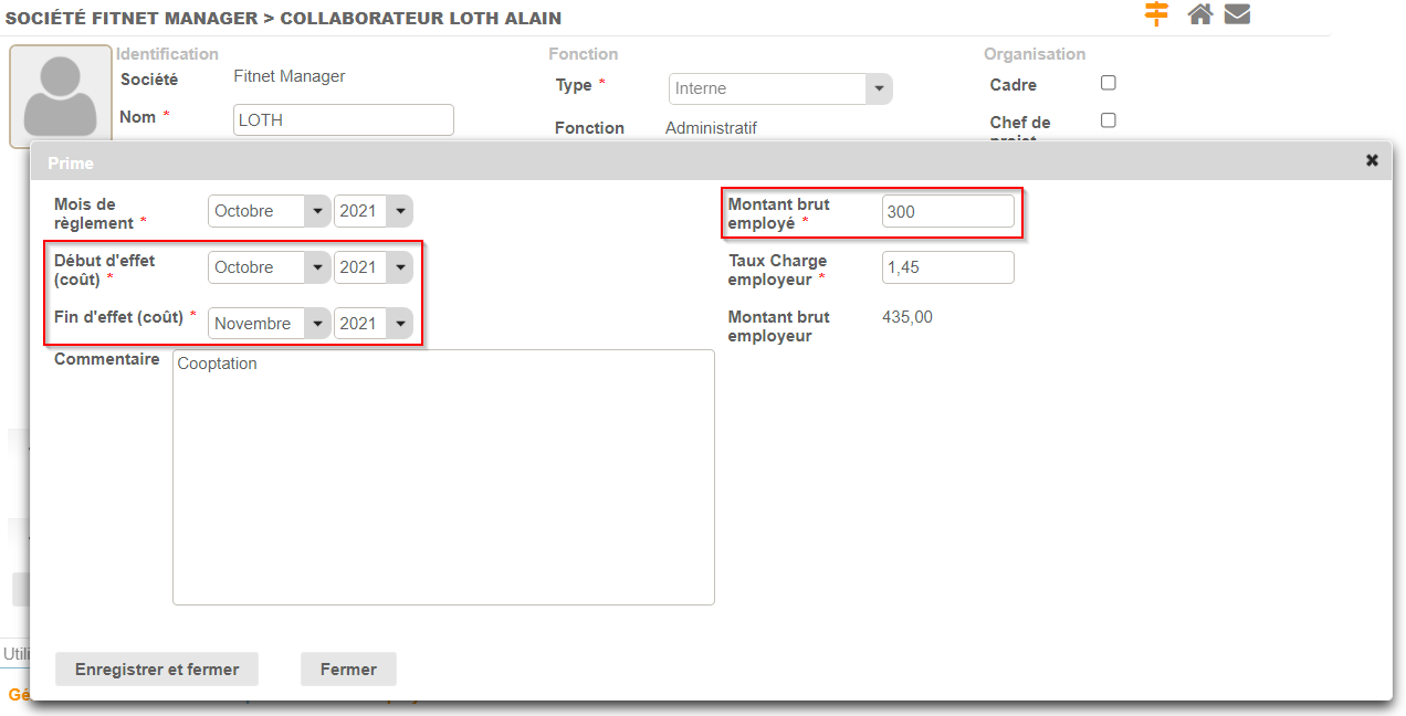 La création d'une prime impacte directement le coût employé en fonction de la période de début et fin d'effet définie lors de la création de cette dernière.