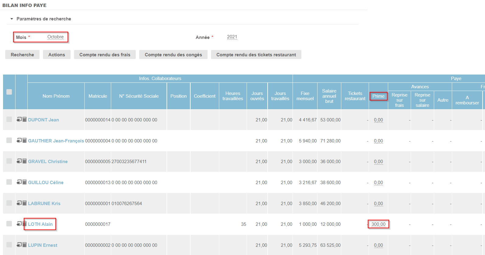 On voit ainsi que dans notre exemple, sur le mois d'octobre, le versement de la prime du collaborateur Alain LOTH est bien prise en compte dans le bilan de la paye.