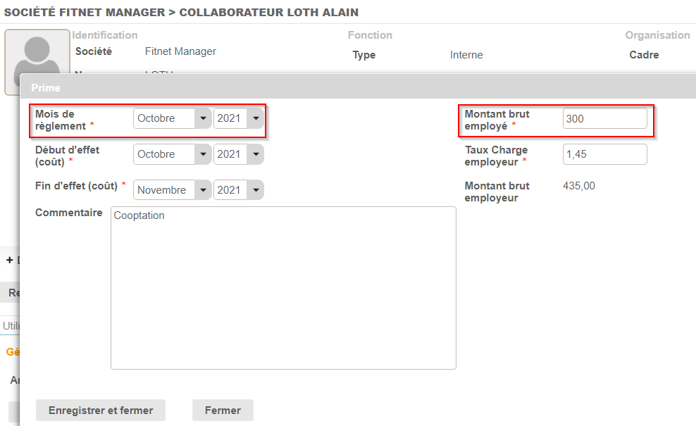 Nous allons par exemple créer une prime de 300€ brut (hors charges) pour le collaborateur Alain LOTH qui lui sera versée au mois d'octobre et pour laquelle nous souhaitons que le coût soit impacté sur les mois d'octobre à novembre :